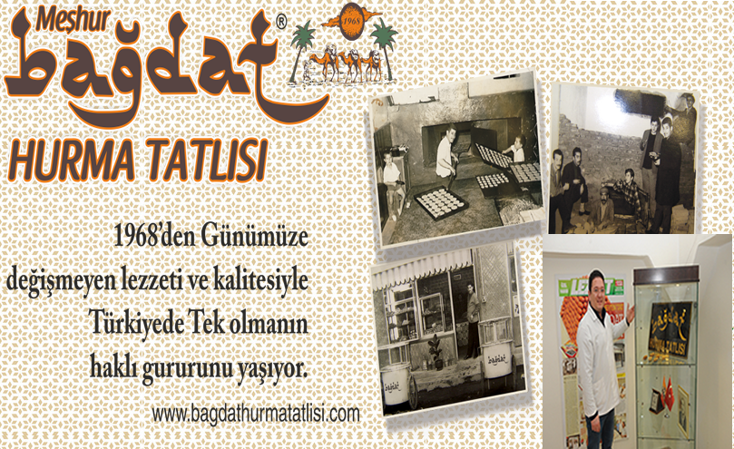 1968 yılından bu yana üretilmekte olan meşhur BAĞDAT HURMA TATLISI, çeşitli adlar altında ve çeşitli kişilerce taklit edilmekte olup, Bağdat Hurma Tatlısı'nın tanınmışlığından ve tercih edilirliğinden yararlanmak istenilmektedir. Bu tatlıların, Bağdat Hurma Tatlısı markamız ve Firmamız ile bir ilgisi bulunmamaktadır. Bu nedenle, benzer adlar altında üretilen ve satışa sunulan, ürünlerin üretim ve hijyen koşulları nedeniyle üçüncü kişilerin uğradığı zararlardan Firmamızın bir sorumluluğu bulunmamaktadır.
